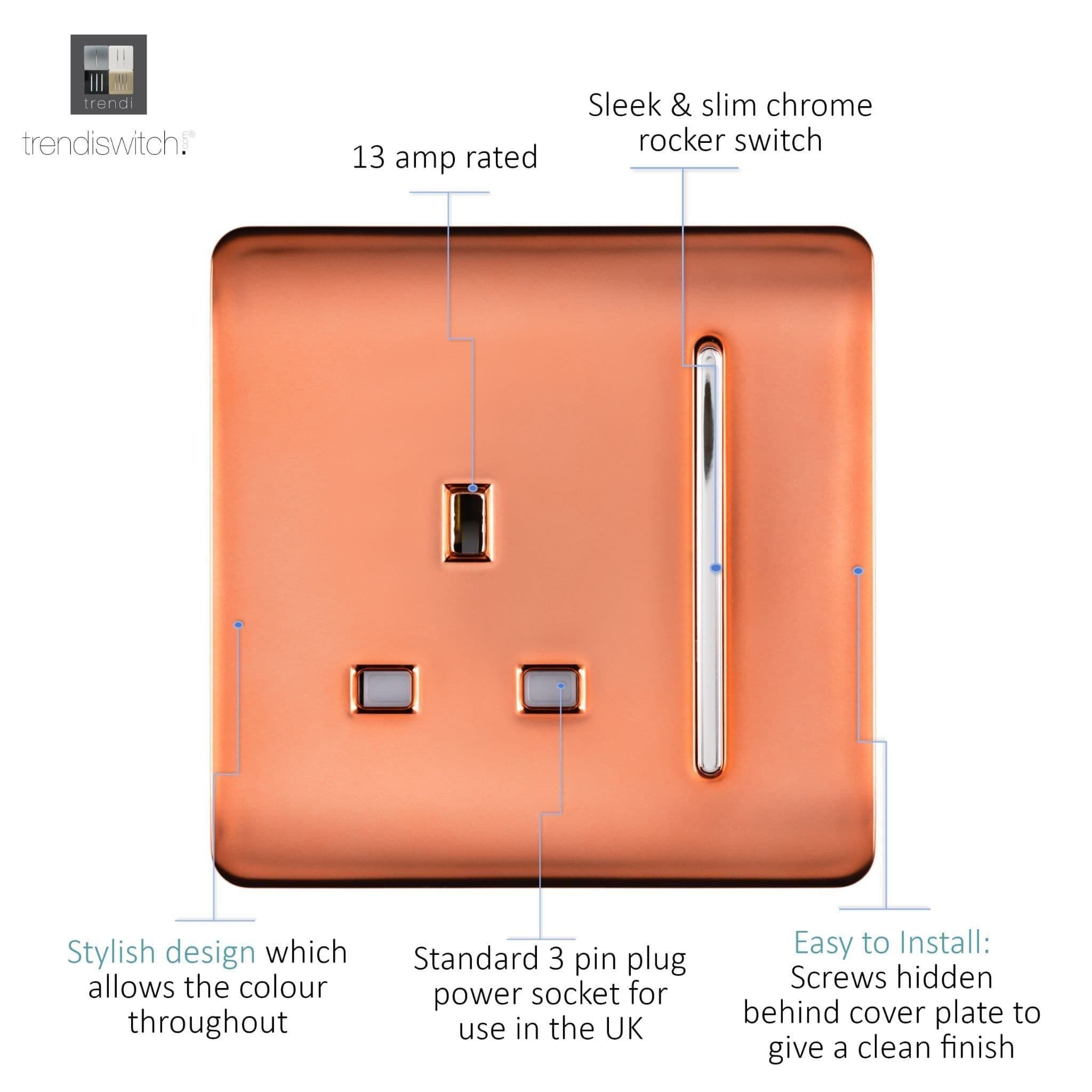 Trendi Switch 1 Gang 13 Amp Switched Modern Designer Plug Socket in Copper