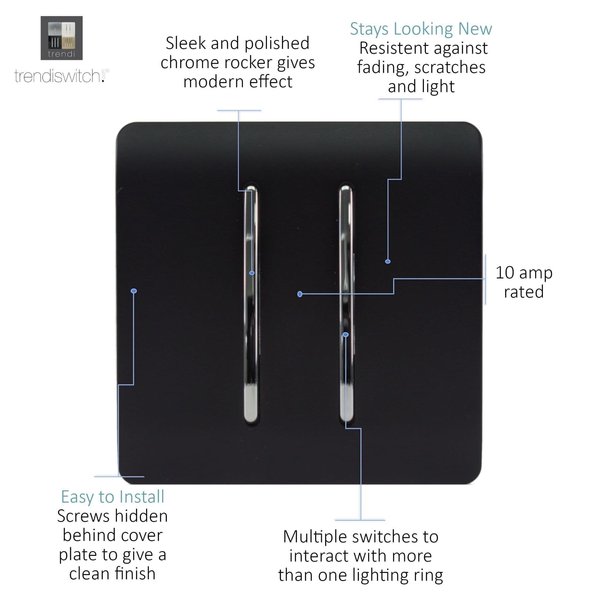 The Trendi Switch range of 2 gang 1 or 2 way modern designer rocker light switches comprise of a sleek chrome rocker switch on a "screwless" plate displaying the complete colour of the products. This is supported by a back frame that houses the screw holes & module for the product to be installed into compatible back boxes and wiring.