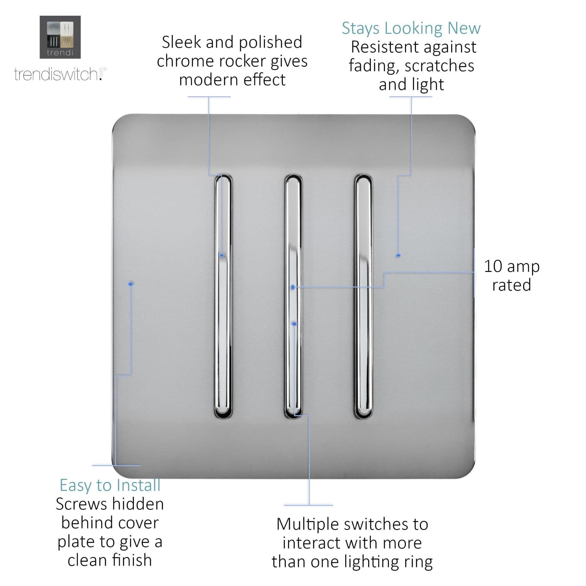The Trendi Switch range of 3 gang 1 or 2 way modern designer rocker light switches comprise of a sleek chrome rocker switch on a "screwless" plate displaying the complete colour of the products. This is supported by a back frame that houses the screw holes & module for the product to be installed into compatible back boxes and wiring.