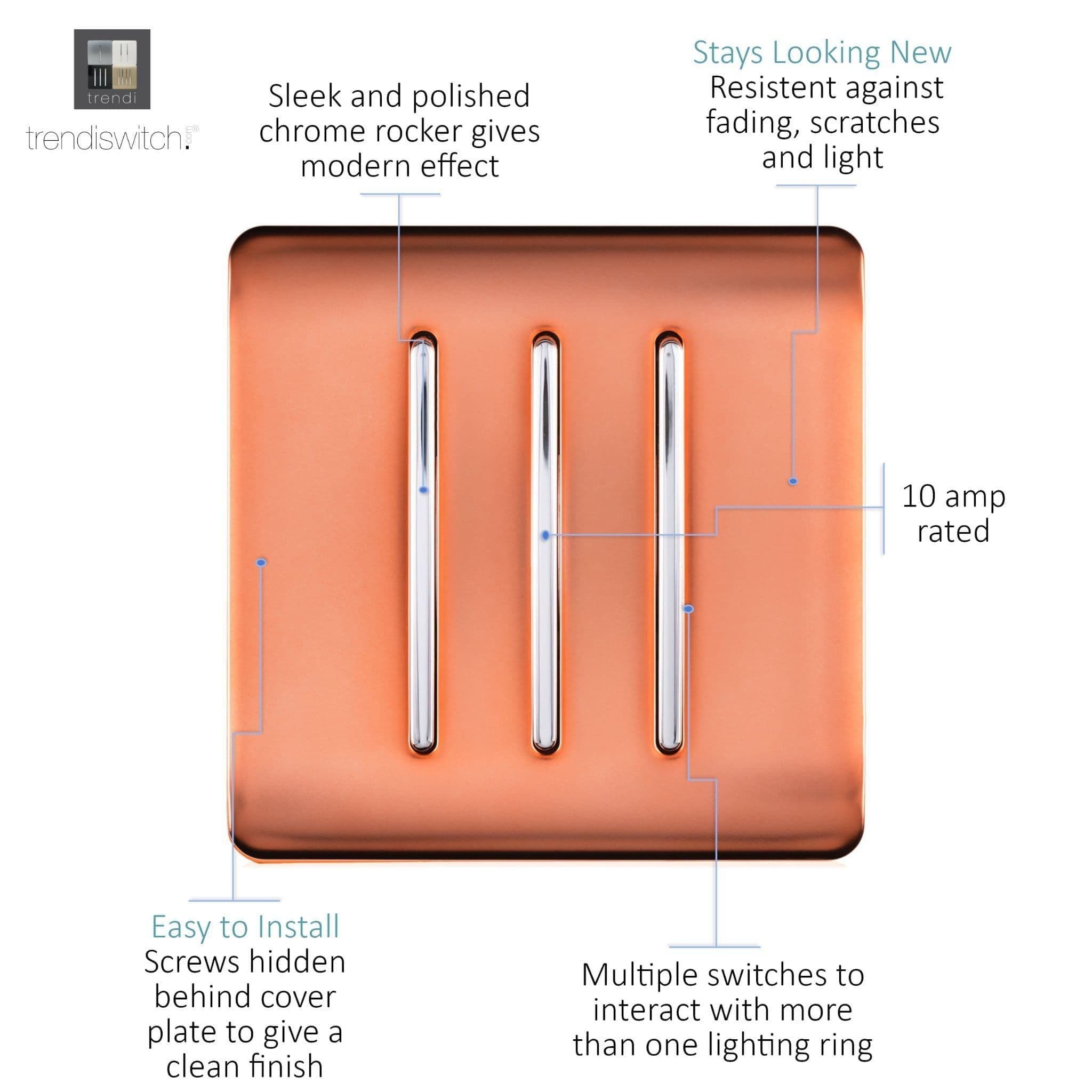Trendi Switch 3 Gang 1 or 2 way Rocker Modern Designer Light Switch in Copper