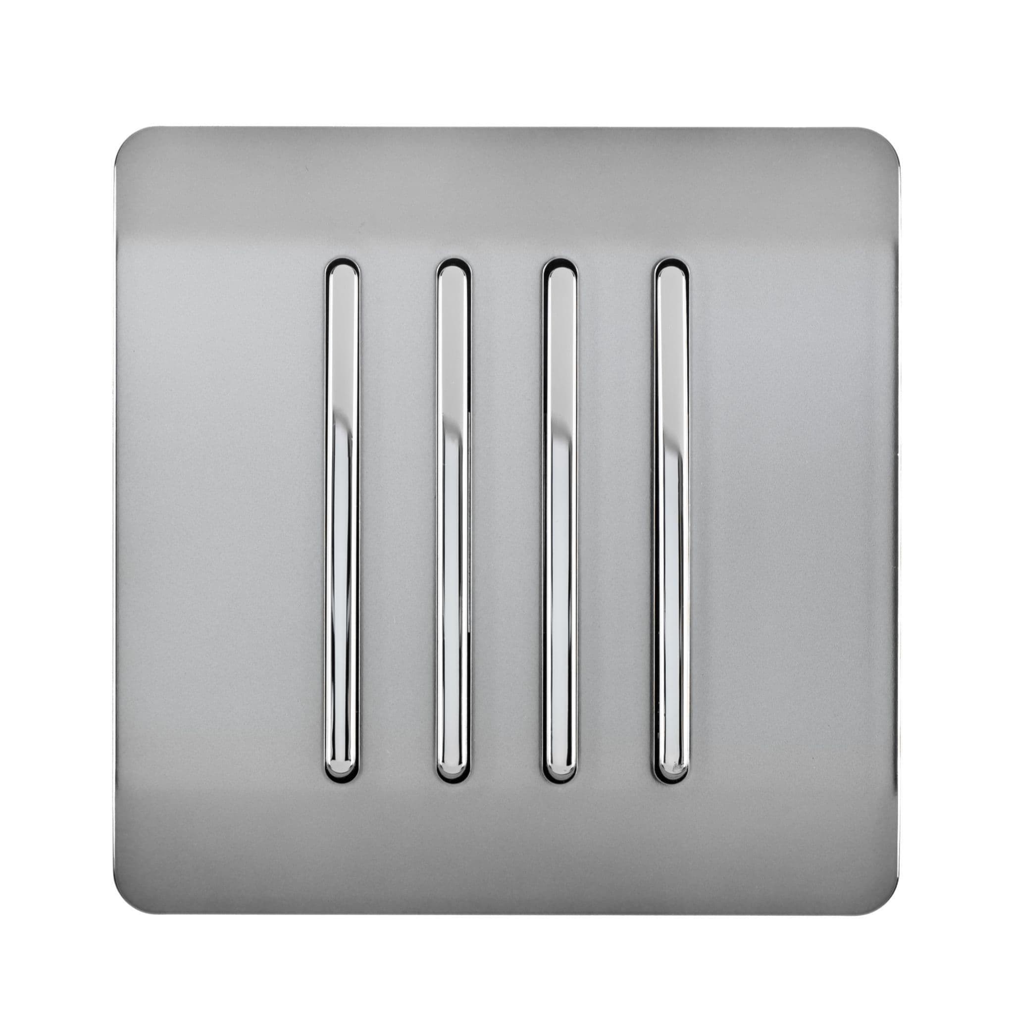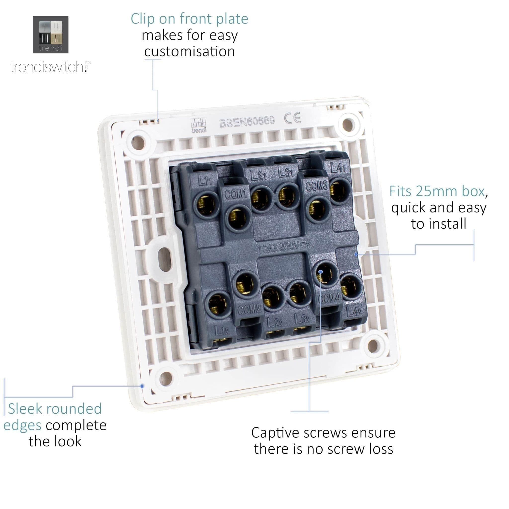 The Trendi Switch range of 4 gang 1 or 2 way modern designer rocker light switches comprise of a sleek chrome rocker switch on a "screwless" plate displaying the complete colour of the products. This is supported by a back frame that houses the screw holes & module for the product to be installed into compatible back boxes and wiring.